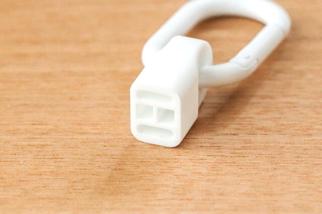 小さなカラビナにコンパクトなパーツがくっついた特徴的な形状をしています。