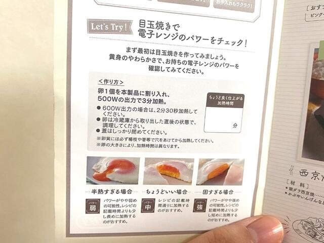 レシピブックでは、まずは目玉焼きをつくって家庭のレンジのパワーをチェックすることが推奨されていました。