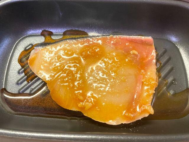 ぶりの切り身に調味料をまぶして加熱したら、あっという間に照り焼きの完成です。
