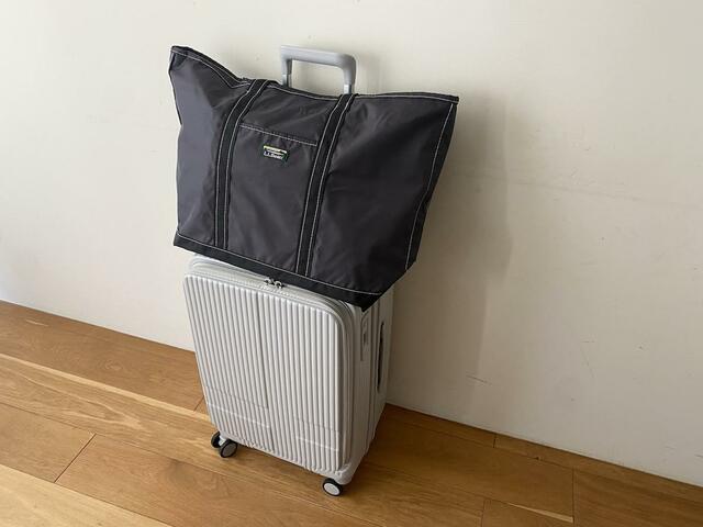 マチ付きで底が平らになるため、スーツケースの上に置いても安定します。