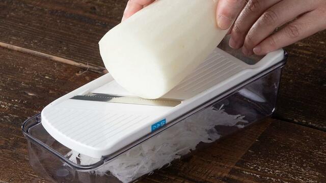 ボウルの上に置いてスライスするとガタガタしがちですが、こちらはスライサーにあったサイズなので安定して使えますよ。