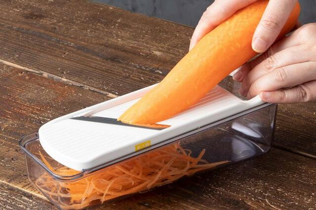下村工業の「ベジタブルスライサー 野菜工房II」は、スライス・千切り・ツマ切り・おろしの4種類が作れるスライサーセット。