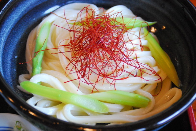 糸とうがらしと、アスパラガスがトッピングしてあるうどんを、つけだれにつけていただきます。つけだれの中には、温泉卵と甘辛く煮たオリーブ牛が。