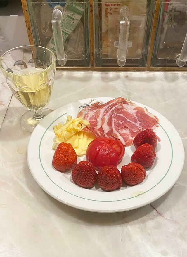 前菜用に並べたのはトマト、いちご、Fol Epi(という名のチーズ)、ポルトガルの生ハム、白ワイン(あは! またもや手抜き!)。