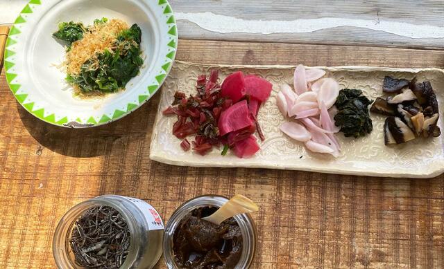 他にはほうれん草のおひたし、京つけもの(赤かぶら、日野菜、椎茸)、小松昆布、梅醤、ごはん、赤尾鯛(赤魚)の粕漬け、スナップエンドウの味噌汁。
