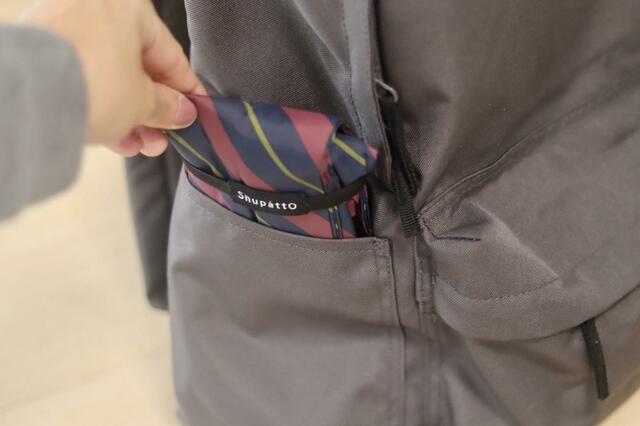 また、左側にもファスナーがついていて、中のものをササっと取れるようになってます。リュックを背負ったまま折り畳み傘もさっと取れるので便利ですよ。