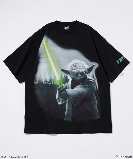 『スター・ウォーズ/クローンの攻撃(エピソード2)』より、輝くライトセーバーを持った「ジェダイ・マスター ヨーダ」がフロントにプリントされたTシャツはインパクト抜群。