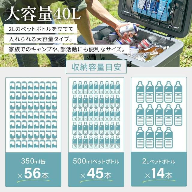 40Lのモデルは、2Lペットボトルは14本、500mlは45本、350ml缶に関しては56本と家族でのキャンプや、部活動など大人数でも安心して使えますよ。