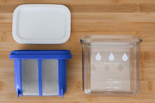 グリークヨーグルトメーカーには、本体容器とステンレスメッシュがついた水切りザル、フタがセットになっています。