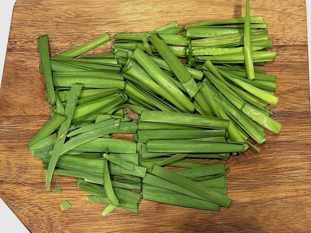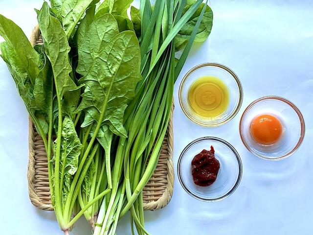 1. ほうれん草とニラは洗って食べやすい長さにカットする。根元に近い部分は短めに切ると、火の通る時間が均一になりやすい。