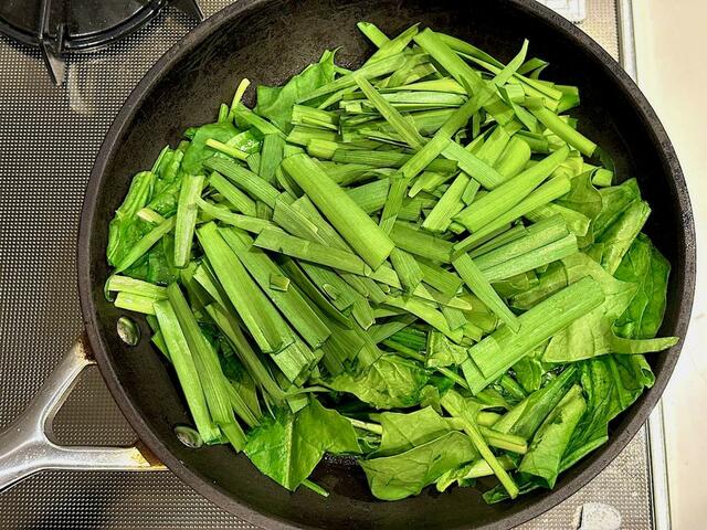 2. フライパンをあたためて、ほうれん草とニラの根元に近い部分から入れる。水を大さじ2ほど加えて混ぜながら中火で炒めたら、葉先のほうも入れて炒める。