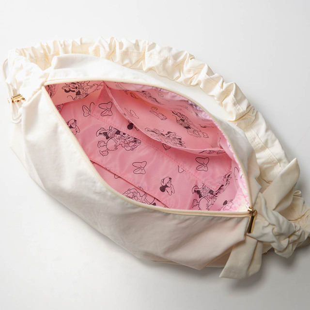 内生地は、ミニー&デイジーデザインの華やかなピンクの総柄となっており、バッグを開けるたびに思わず笑顔になってしまいそう。