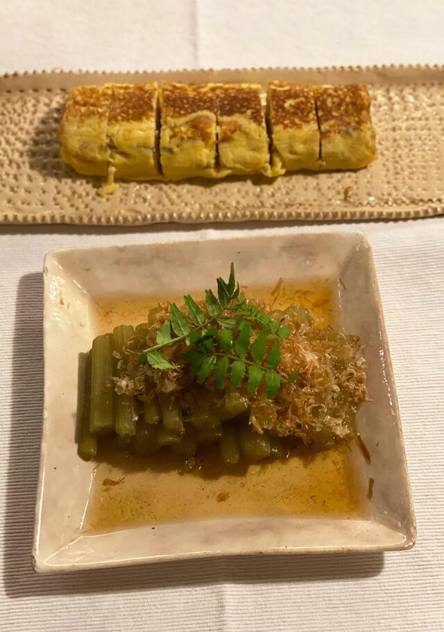 まずは卵焼きと蕗煮(蕗は庭で生育)、