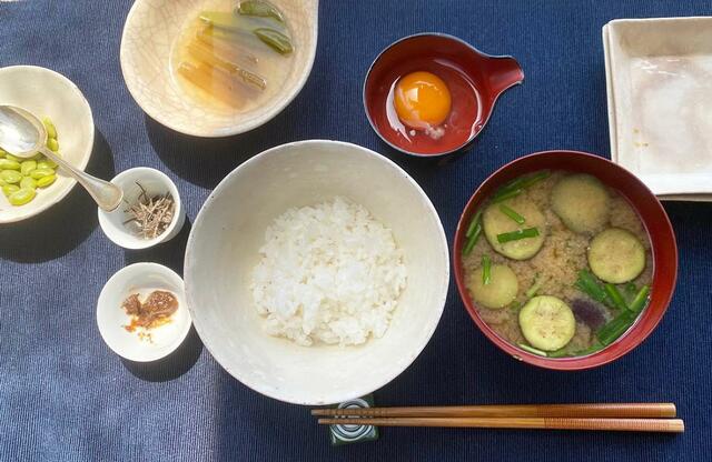 卵かけごはんとなすとニラの味噌汁。海外からの旅人に、生卵が人気だってね(TV情報)。