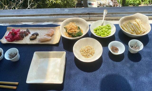京漬物、枝豆、蕗煮、カリカリしらす干し、小松昆布、梅醤。