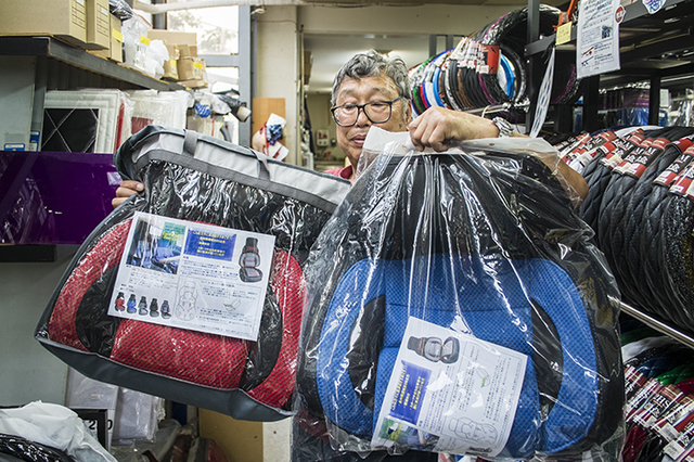 カバー自体の色や柄だけでなく、ステッチ(縫い目)の色も選んで好みのものをオーダーメイドで作ることもできる。乗用車用サイズもあって、「ネットでは色のイメージが伝わりづらいので、お店にきて実際の色を確かめてみてほしい」とのこと。