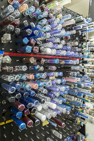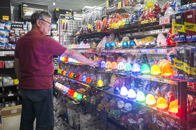そして、変わらぬ人気商品はシフトレバーの先端に取り付けるシフトノブ。きれいな色のものがたくさんある。