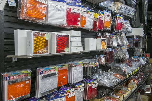 各色がそろうサイドマーカーランプ、トラック用ホーン各種(長いのは昔のデコトラ用で見える場所に取り付けた)、テールライトカバー各種、サポートもしっかりした蒸れにくいシートカバーなどなど。