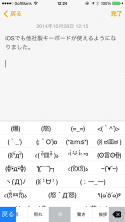 また、顔文字が豊富なのも特徴。キーボード上の「^_^」マークをタップすると、顔文字一覧が表示されます。感情を指定すると膨大な量の顔文字が登場。しかも、個性的な顔文字が多い! これだけでもSimejiを使う価値があります。