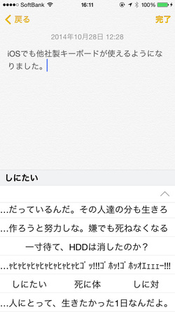 Masuoさんの動画でも紹介されていますが、「しにたい」と入力すると、さまざまな文章が変換候補に出ます。ちょっと落ち込んだときに見ると、元気が出るかもしれませんね(日本語入力アプリの使い方とは離れてますが)。