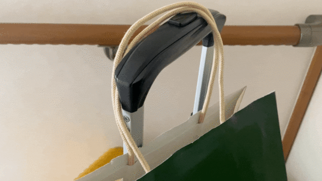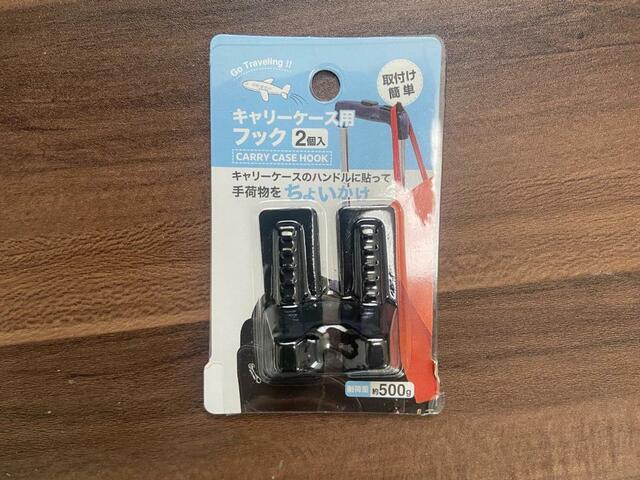 キャリーケースの取手部分にこれを貼り付けるだけで、手荷物をちょっとかけておけるようになります。