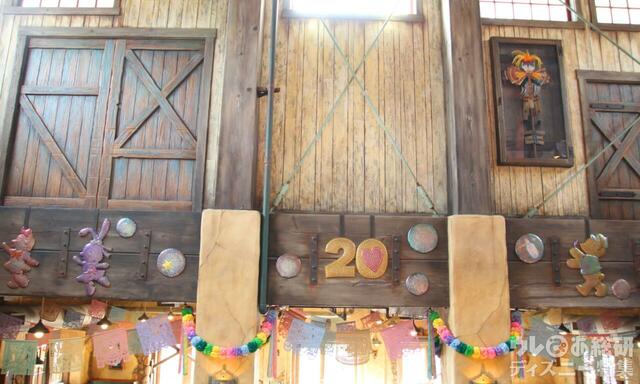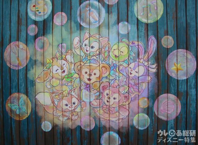 お店の入口上には、ダッフィーたちのシルエットのアート、20周年ロゴ、それぞれのシャボン玉。