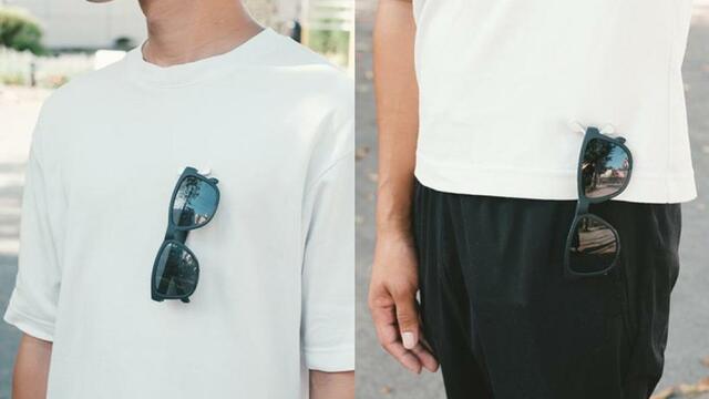 マグネットの力でホルダーがしっかり服に固定されて、サングラスを服の好きなところにぶら下げられるようになるんです。