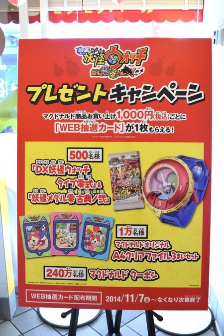 ふたつめは、「DX妖怪ウォッチ タイプ零式」などが当たるプレゼントキャンペーン。マクドナルド店舗で1000円以上買うと、抽選に参加できます。賞品は妖怪ウォッチアイテムやマクドナルド商品割引クーポンなど。