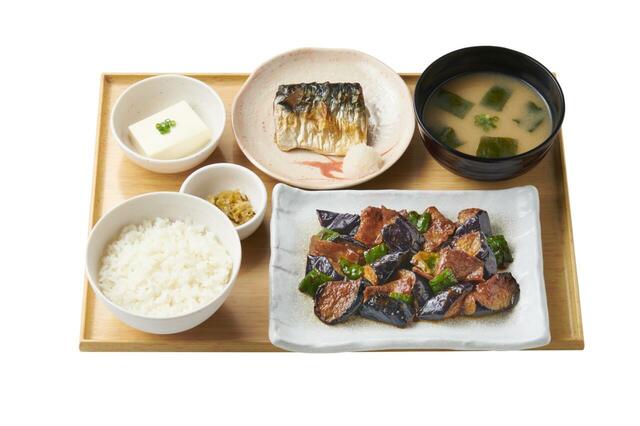 特製味噌ダレで仕上げた「豚となすの味噌炒め」とパリッと皮が焼けた「サバの塩焼」が特徴の定食です。