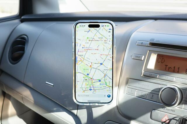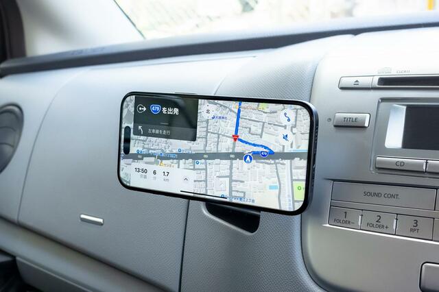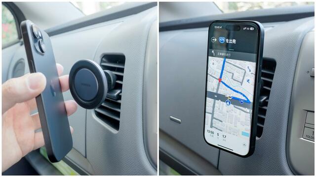 車への取り付けが終わったら、あとはMagSafeに対応したiPhoneの背面を重ね合わせるだけ。慣れればここまで10秒もかかりません。