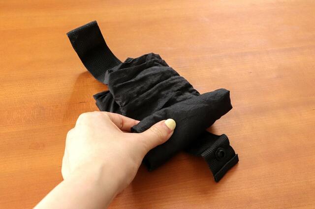 たたむのもカンタンで、中心に向かってたたんでクルクルと巻き取り、ベルトのスナップボタンで留めるだけ。