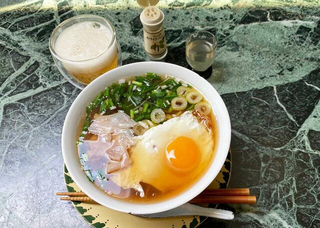 喜多方ラーメン(目玉焼き、生ハム、ニラ)、Beer。