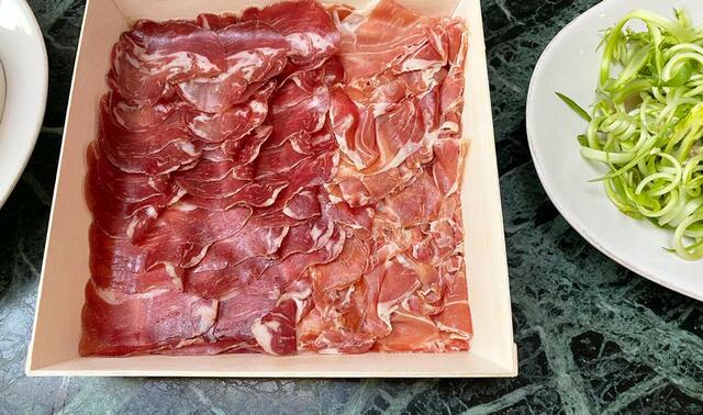 麻布台ヒルズにあるイタリアンチーズ店Fioridimasoの生ハム(たくさん!)と大きなサイズのブッラータとゴロンと割られたParmigiano。