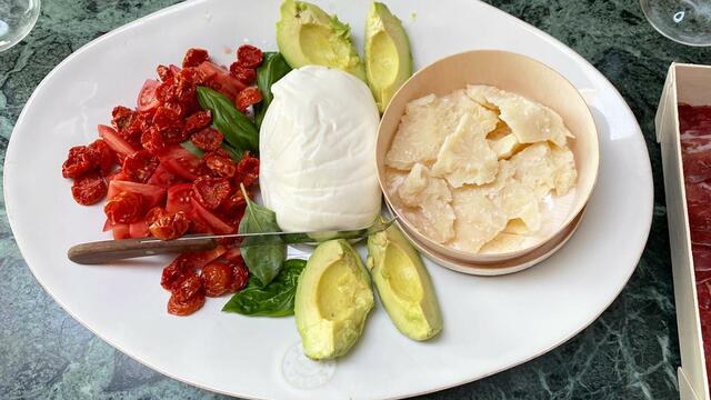 素晴らしいものたちを眼前にして、正気を失った私。そこで私のしたことは、ブッラータと生ハムとパルミジャーノを中心に、生トマトとドライトマトとアボカドをお皿に盛り付けただけでした。