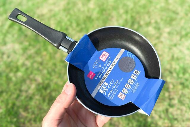 そんなときに見つけたのが、ダイソーで販売されている「軽量フライパン(14cm、ダイヤモンドコーティング)」です。
