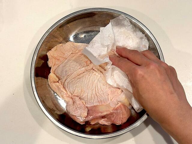 2. 鶏肉の両面についたドリップを、キッチンペーパーで拭きとる。両面に塩・こしょうをしてなじませる。