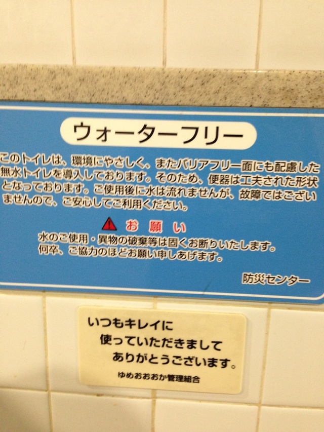 さて正面を見ると、無水トイレ(ここではウォーターフリーと記述)の説明書きのパネルがあり、ここを管理しているのが防災センターだと分かる。