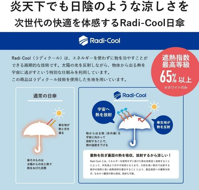 通常の日傘と比べて表面温度は-6.3℃になり、炎天下のなかでも日陰にいる感覚を味わえるそうです。