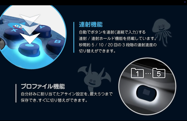 おまけに、自動でボタンを連射(連続で入力)する「連射/連射ホールド機能」も搭載されています。