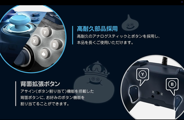 品物を長く愛用できるよう、耐久テストをクリアしたアナログスティックやボタンなどの「高耐久部品」を採用。