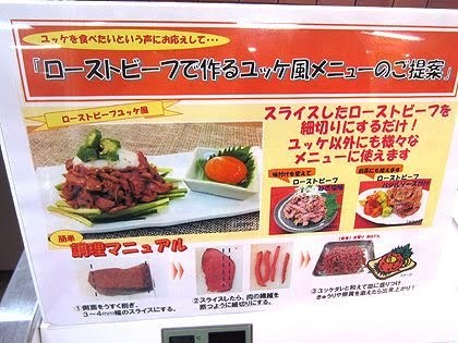 桜肉ユッケは、禁止にならないように、細心の注意をはらわれていて、「きざんだモノが真空パックに入っていて、このまま開けてお客様に出せば大丈夫」という商品を紹介していました。これならアルバイト店員さんにも出来る作業で、安心。