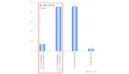 買い替え予定者(「買い替えを予定しており、時期も決めている」と「買い替えを予定しているが、時期は決めていない」の合計)は52.3%で、半数以上は買い替え予定であることが明らかになった。また、すでに買い替えたという回答者も2.4%存在している。