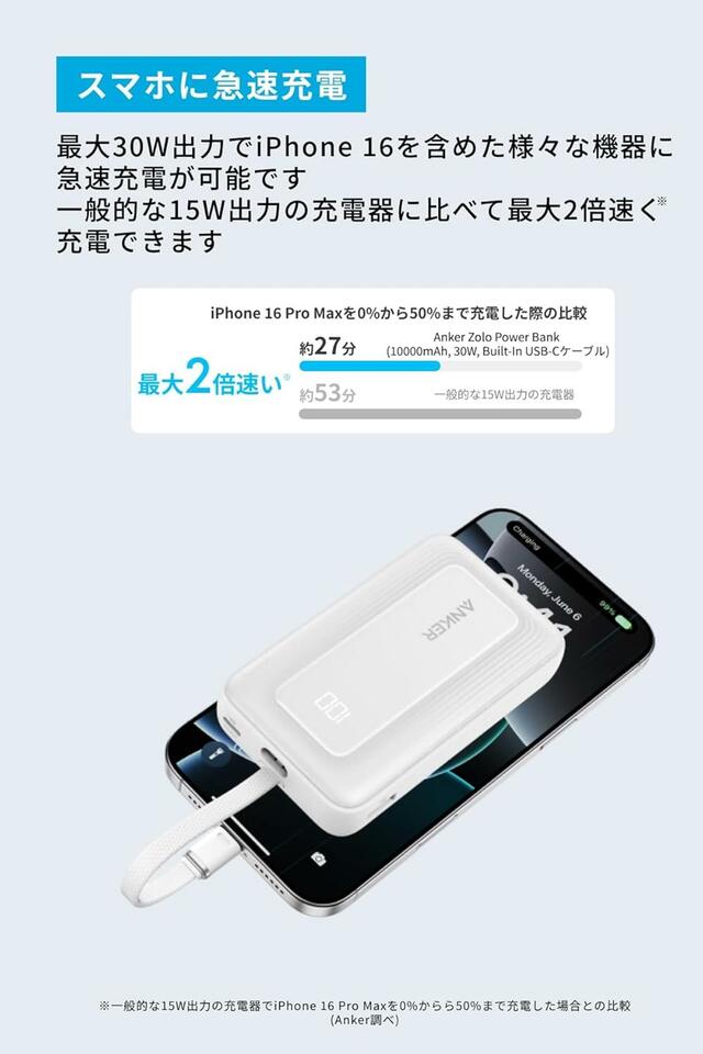 ほぼすべてのスマホを急速充電する、Anker(アンカー)の新作モバイルバッテリー「Zolo Power Bank(10000mAh, 30W, Built-In USB-Cケーブル)」