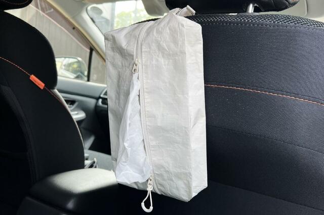後部座席には子どもが乗るので、なにかとティッシュが必要な場面が多くて。無印良品の「ポリエチレンシートケース L」を前の座席のヘッドレストにつけて、いつでも取り出しやすい状態にしています。