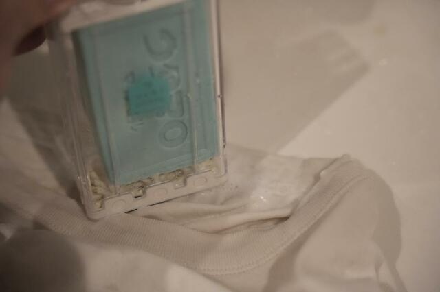 Tシャツの首周りなど、汚れを落としたいところでブラシをくるくる回すように擦ってあげると、どんどん泡が出てきてそのままブラシで汚れが綺麗に落ちていきます。