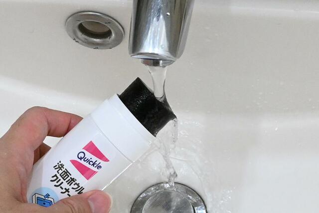 洗剤と抗菌スポンジがひとつになっていて、先端のスポンジを洗面ボウルに押し付けると、ボトルから洗剤が出てくる仕組み。