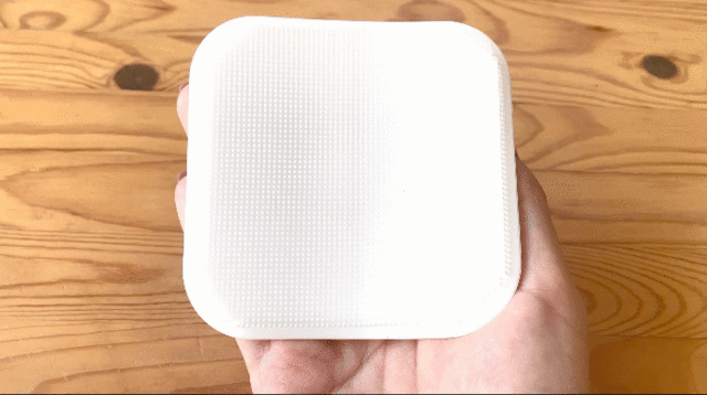 サイズは縦横約9.5cmの正方形で、ふつうのスポンジよりやや大きめです。後ろには持ち手が付いていて、指で挟んで持つことができます。
