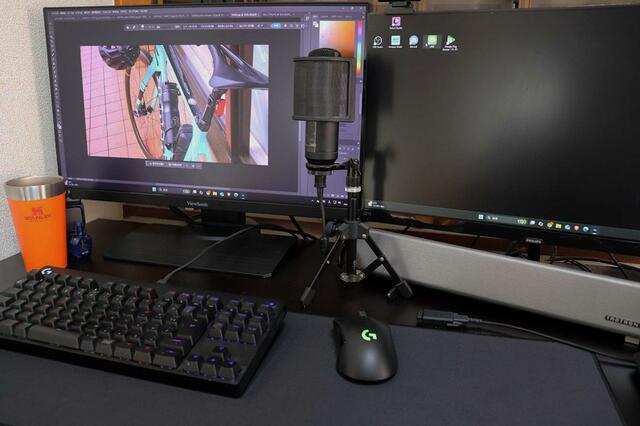 ゲーミングのものとサブ用のものを並べたデュアルディスプレイ、ロジクールの七色に輝くゲーミングキーボード・マウス、大型のマウスパッド、ボイスチャットで役立つ外付けマイク、スタンレーの真空タンブラー、といった構成です。