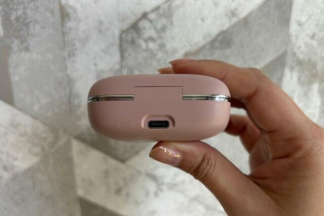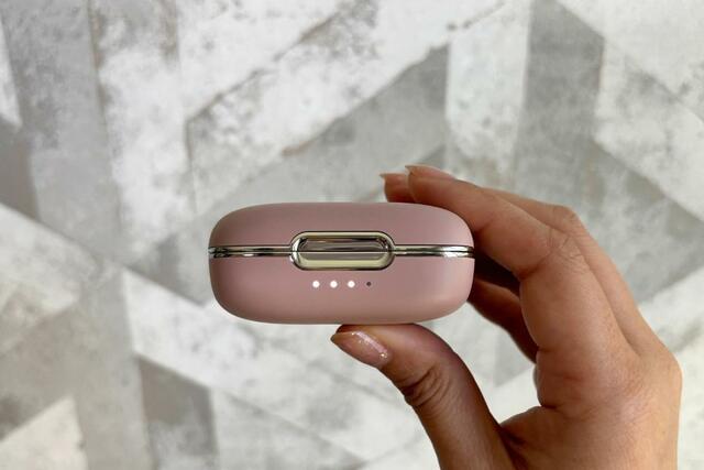 小さめの石けんみたいなコロンとしたデザインがかわいい専用ケースは、充電器としても使える優れもの。フル充電しておけば、イヤホン約3.5回分の充電が可能です。