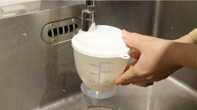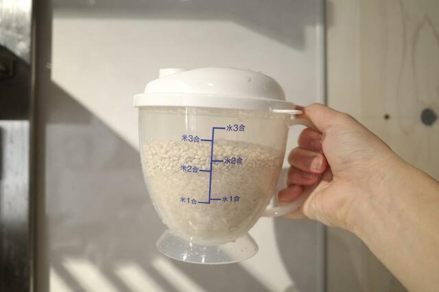 カップにお米と水を入れシャカシャカとシェイクして流す、を2〜3回くり返せばOK。